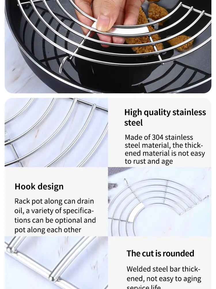 3. Multifunctional, not only can drain the oil, but also can be placed in the pan to steam food Specifications: Products name: stainless steel semicircular hanging pot